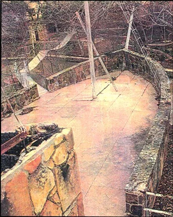 Leon Bandy, who reportedly sketched it after reading magazines, had the magnificent, land-locked ocean liner built from fieldstone that was hauled in by nearby farmers. It lurks above the creek, accessible via a long swinging bridge. It is 125 feet long with two masts, each with a crow’s next, and an intact terrazzo dance floor whereupon guests once gambled the night away.