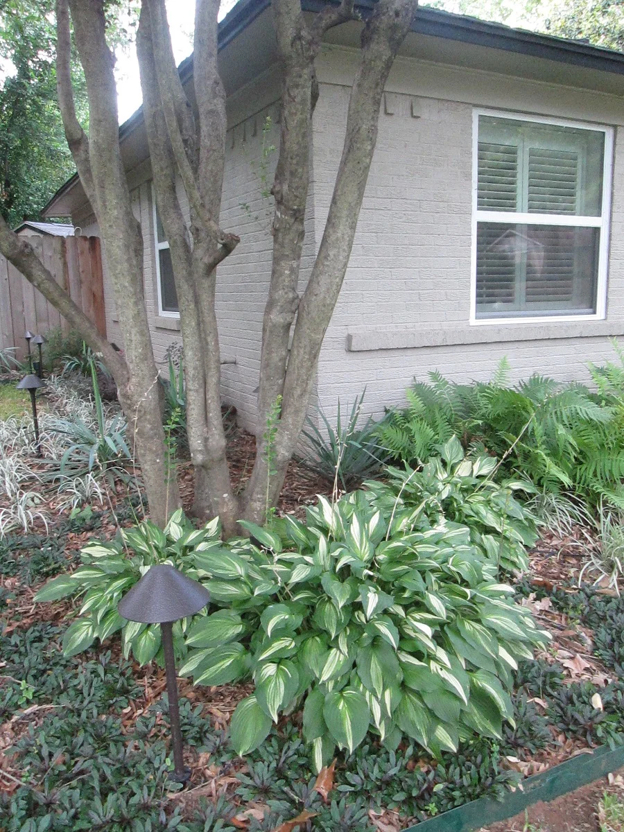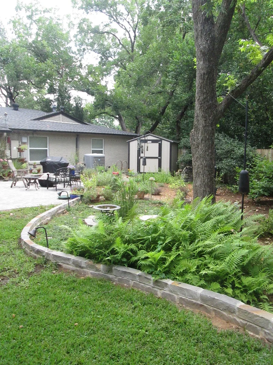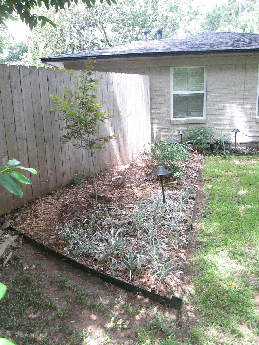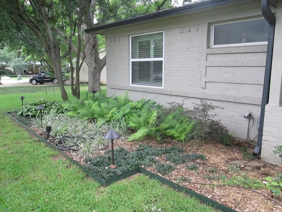 This texture filled shade garden was installed in Arlington, Texas and is proof that you do not have to have full sun to have a beautiful garden! Encompassing a mixture of Hostas, Sedges, and grasses, this installation accents this home perfectly. We also landscaped this client’s backyard.